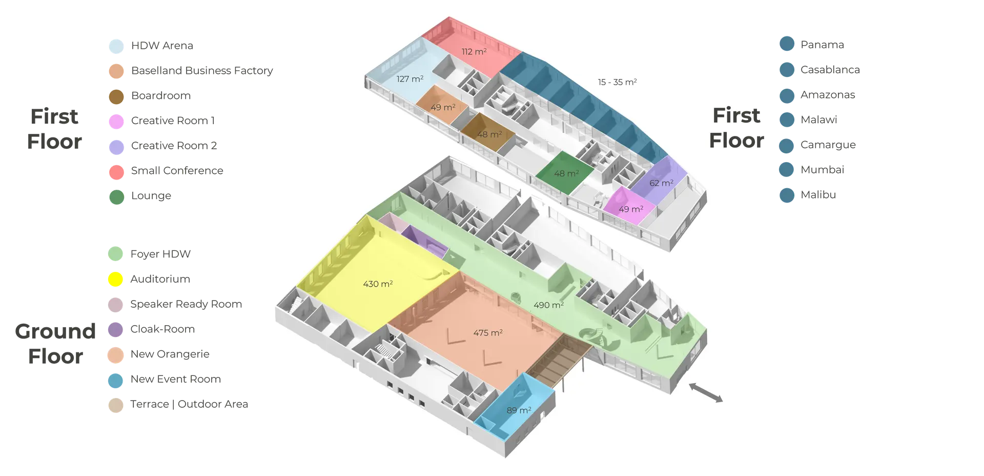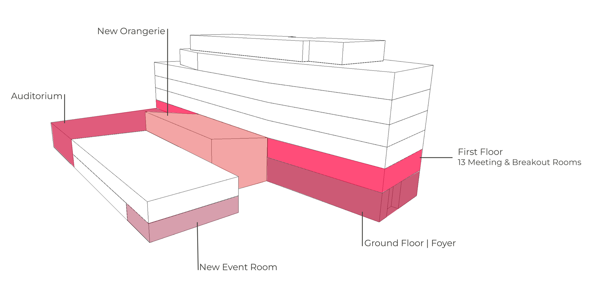 16 vielseitige, moderne Räume, ein beeindruckendes Auditorium für bis zu 300 Gäste mit einer atemberaubenden 11 × 3.5 m LED-Wand und der brandneuen 470 m² grossen Orangerie, die mit Tageslicht geflutet ist.